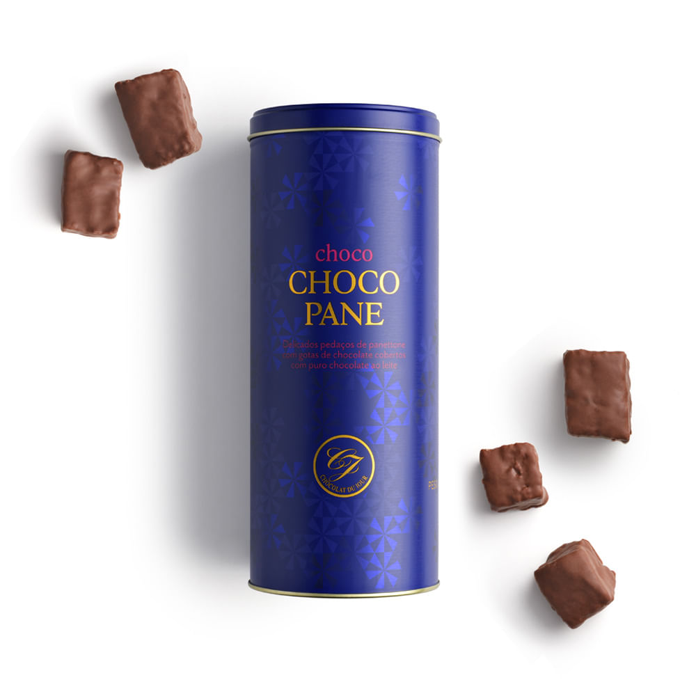 Pedaços de panetone recheados com gotinhas de chocolate e cobertos por uma super camada de puro chocolate Ao Leite.